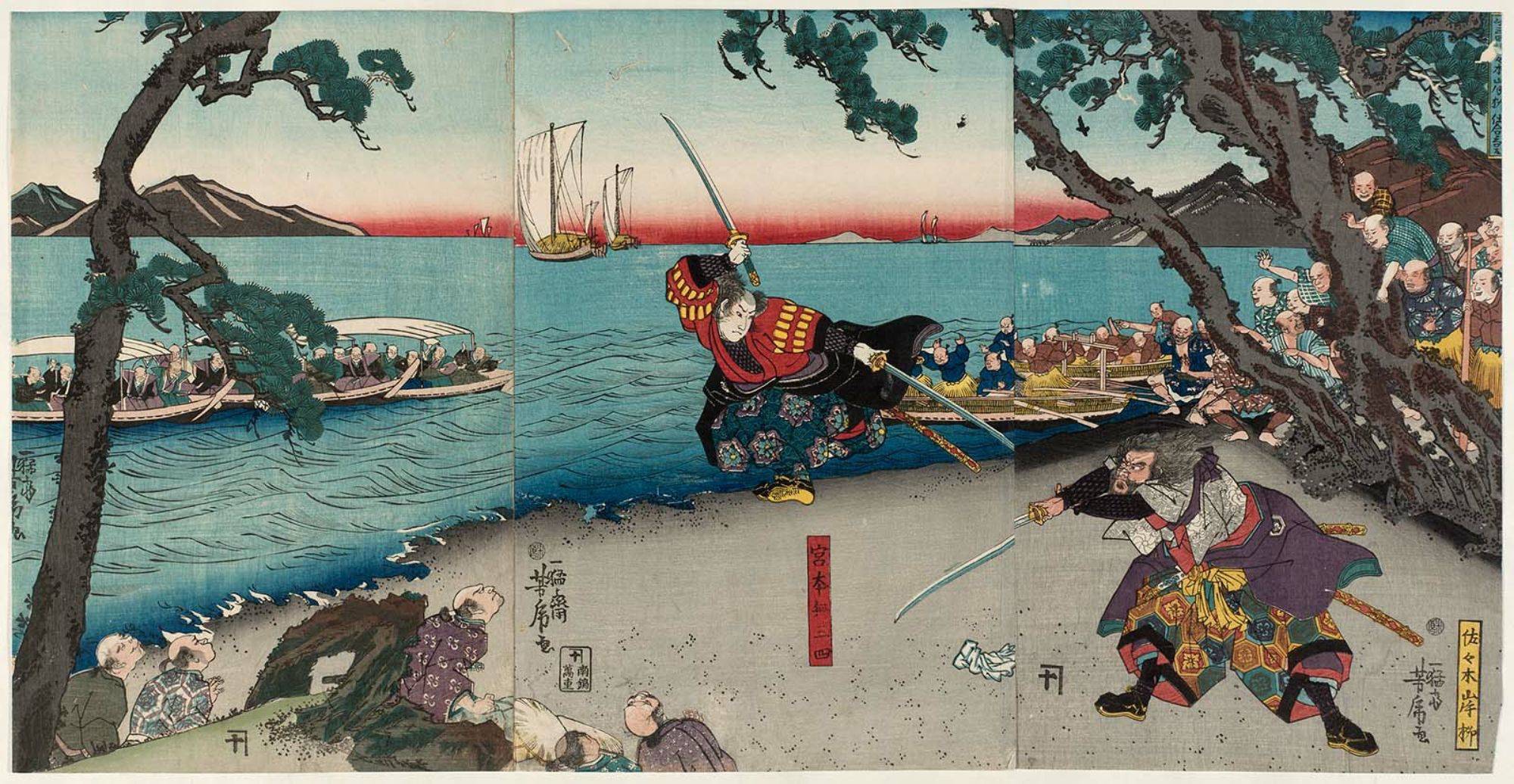 К тому моменту, когда Миямото Мусаси доплыл до острова, он уже опоздал на три часа, время подходило к обеду, и Сасаке Кадзиро был в бешенстве. Так с ним вести себя не посмел еще никто в жизни. Наконец-то лодку прибило к берегу и Миямото без всяких церемоний или даже приветствия достал свое обструганное весло и бросился на противника, который поджидал его у кромки воды.