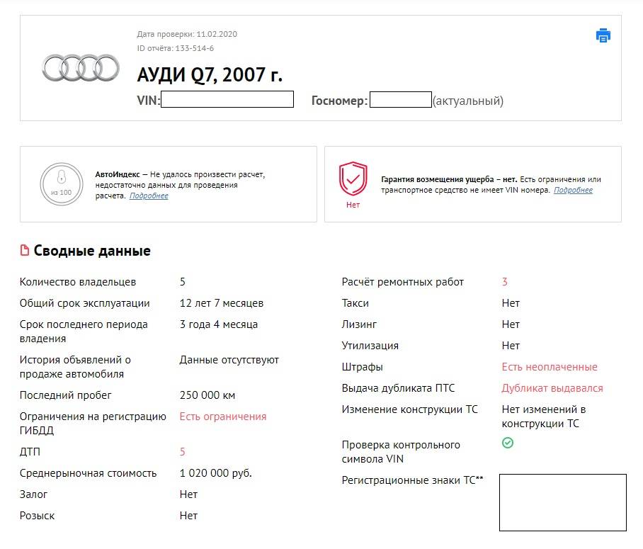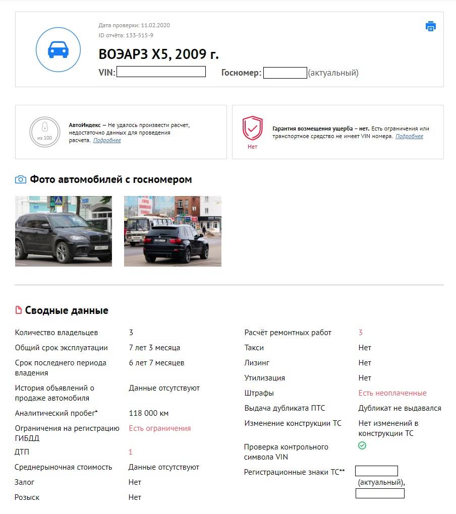 Машина официально всего раз была в ДТП, но расчеты ремонтов производились трижды. Плюс есть ограничения на регистрацию и три неоплаченных штрафа.