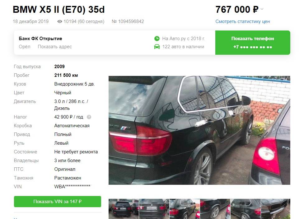 Посмотрим, что предлагают конкуренты. BMW X5 продает банк. Состояние среднее, есть сколы и повреждения ЛКП, зато нет ключей и фото так себе:
