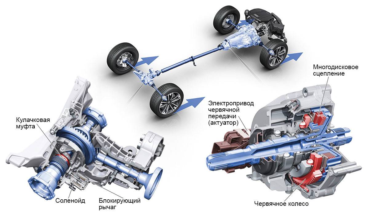 Современная трансмиссия Quattro состоит из следующих основных элементов: