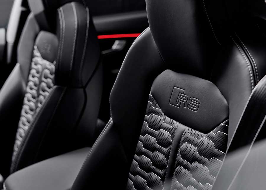 Салон автомобиля в первую очередь привлекает внимание эффектными спортивными сиденьями, обтянутыми кожей Nappa и алькантарой, имеющими хорошо выраженную боковую поддержку и тисненные логотипы RS
