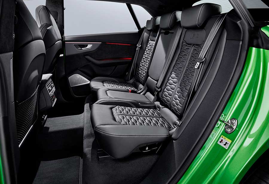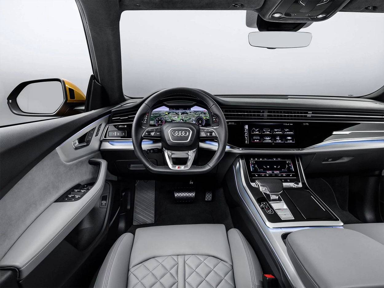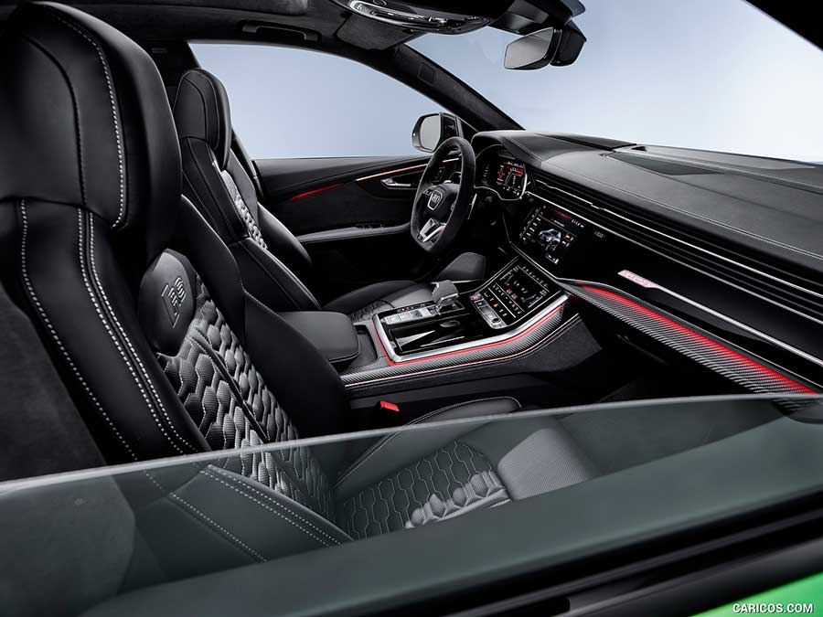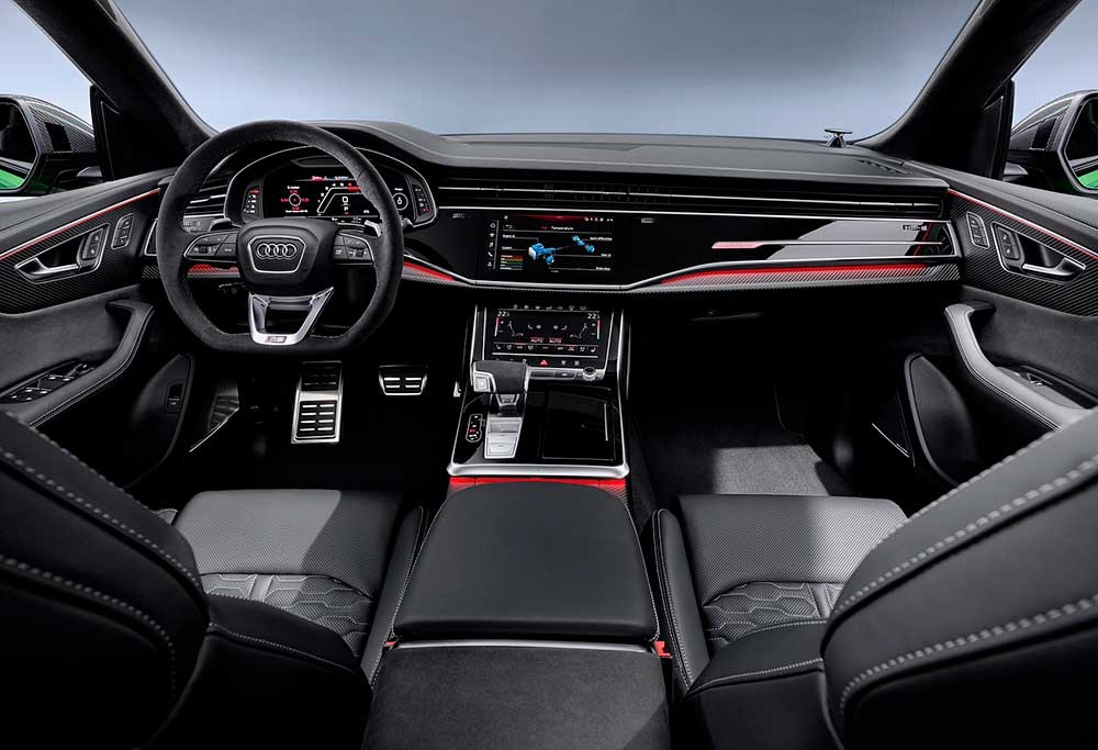 Интерьер Audi RS Q8 отличается от «гражданского» кросса за счёт спортивных кресел (за доплату можно получить мультиконтурные сидения с вентиляцией), усечённого рулевого колеса, RS-графики виртуальных приборов, а также соответствующих модификации декоративных деталей. У автомобиля цифровая «приборка», размер дисплея 12,3 дюйма, а мультимедийная система управляется с 10,1-дюймового тачскрина.