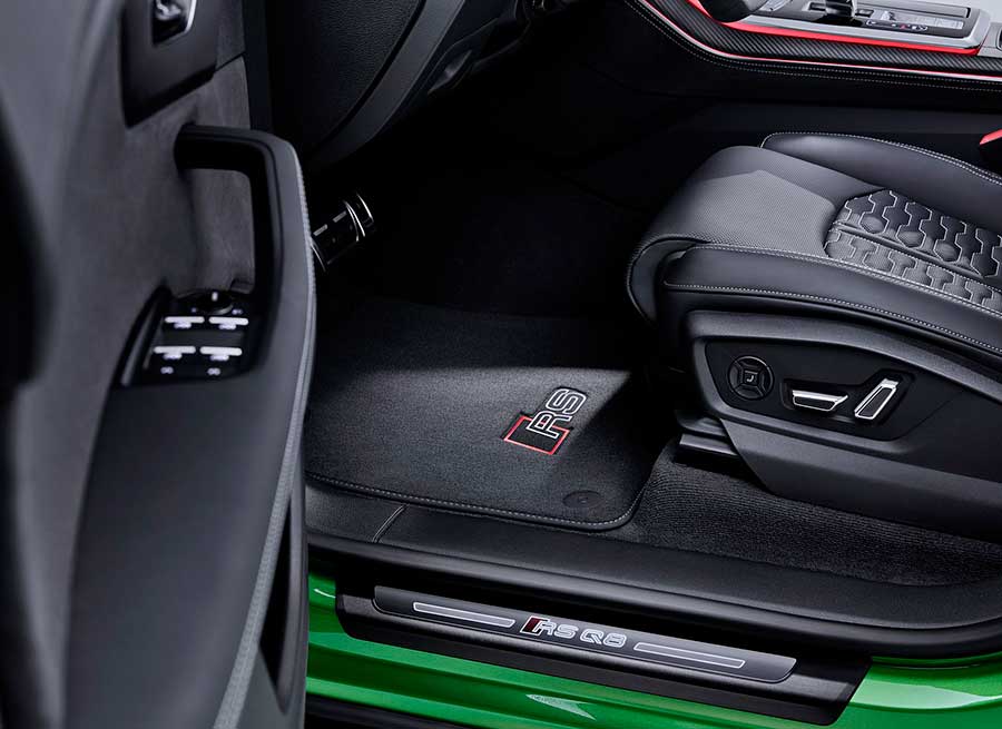 От «обычного» кроссовера Q8 версию с приставкой RS отличают иная радиаторная решётка с чёрным логотипом, воздухозаборники большего размера, два патрубка выхлопной системы по краям кормы и бамперы с контрастными серыми, чёрными или карбоновыми вставками. Из углепластика также сделаны рамка решётки и корпуса боковых зеркал. Опционально доступны матричные фары.