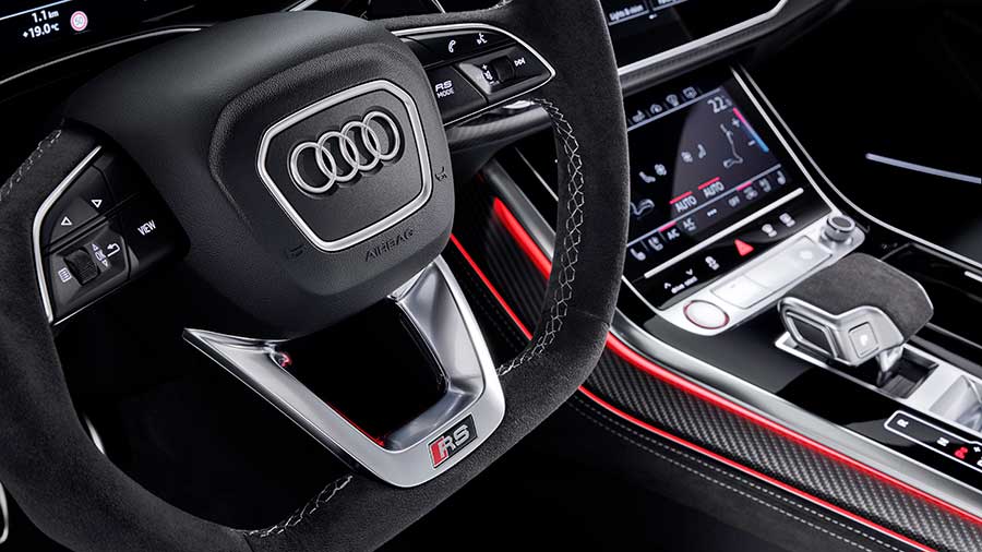 Внутреннее убранство RS Q8 выглядит оригинально и где-то даже футуристично. Интерьер будет отделываться дорогими материалами: кожей, алюминиевыми вставками, алькантарой, мягким пластиком и карбоном. В расширенных вариациях есть возможность добавить в салон декор из благородных пород дерева.