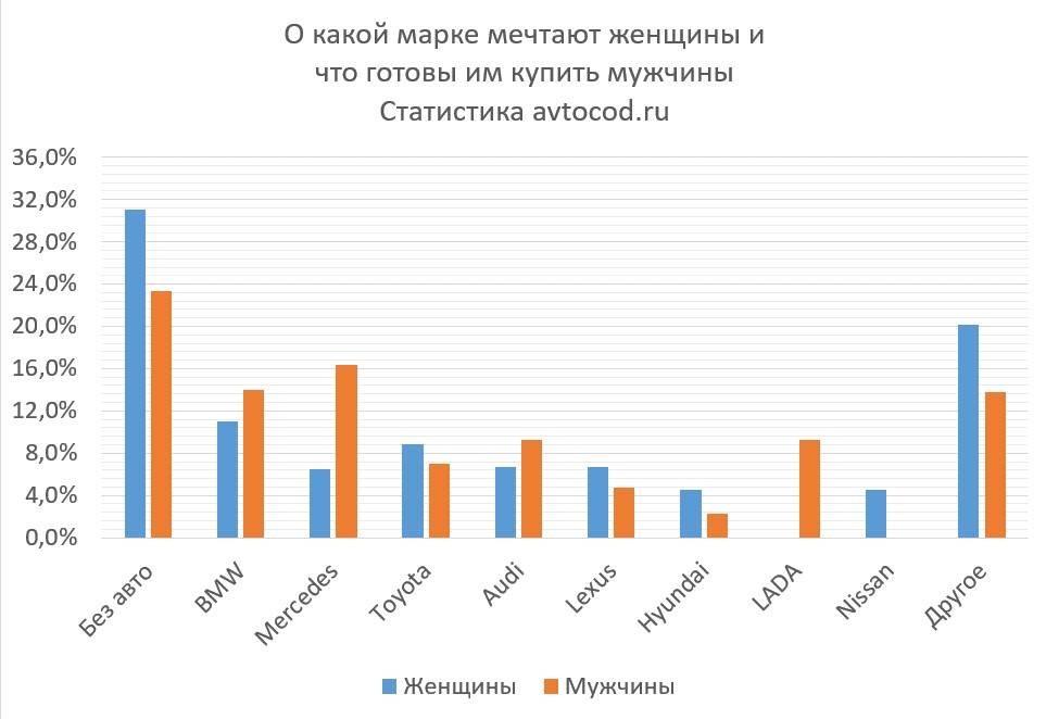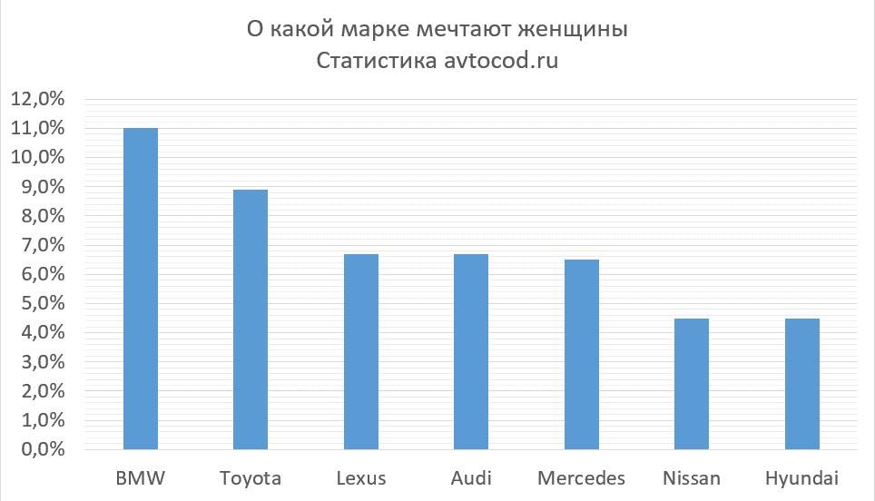 На третьем месте с одинаковым показателем 6,7% разместились Lexus и Audi. Уступив «премиалам» всего 0,2%, на четвертой строчке расположился Mercedes-Benz. И на последнем месте по пожеланиям женщин оказались Nissan и Hyundai. Они тоже набрали одинаковое количество голосов — 4,5%.