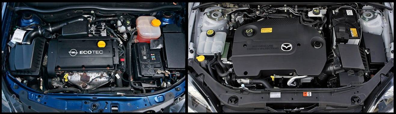 Обе модели имеют по два основных ДВС. У «Астры» это 1,6 л на 115 л. с. и 1,8, л, 140 л. с. Первый более популярен и занимает две трети вторичного рынка. «Мазда» оснащается двигателем 1,6 л, 105 л. с. и резвым мотором 2,0 л, 150 л. с., который встречается реже своего «собрата».