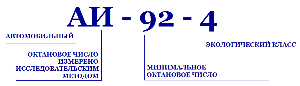 Маркировка бензина состоит из буквы «А» и цифры, соответствующей минимальному значению октанового числа по исследовательскому методу для экспортных бензинов. Буквы «АИ» и цифры указывают, что бензин автомобильный с минимальным октановым числом, определенным исследовательским методом, поставляемых на внутренний рынок.