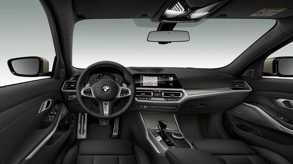 Интерьер топового БМВ 3 серии с индексом M340i демонстрирует почти полное сходство с салоном «младших» версий седана, но без кое-каких метамофроз дело все же не обошлось. Так, самой динамичной модификации отрядили кожаный М-руль с алюминиевыми переключателями смены передач и спортивные сиденья с комбинированной обивкой из кожи Sensatec и алькантары. Еще одной «фишкой» исполнения M340i стали соответствующие надписи с наименованием модели в центре приборной панели и на дверных порогах.
