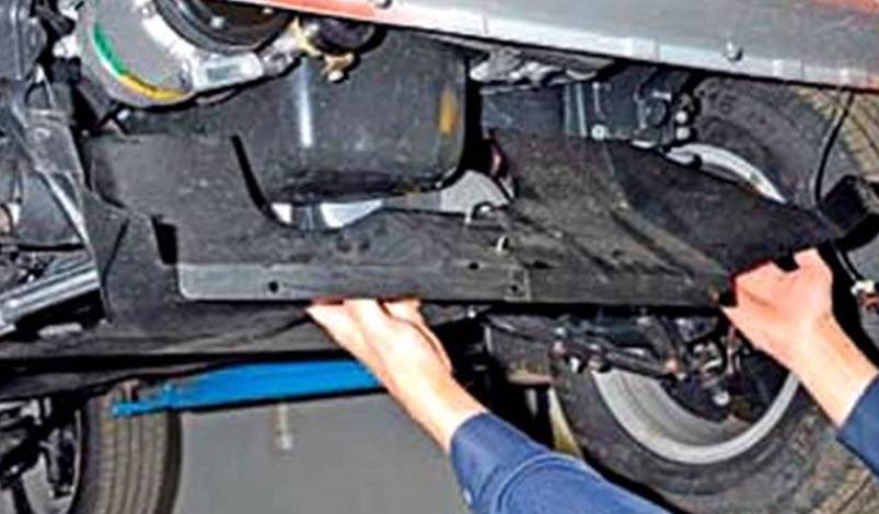 Снизу на днище автомобиля снимается защита двигателя. Это делается для того, чтобы можно было удобно добраться до шкива коленвала.