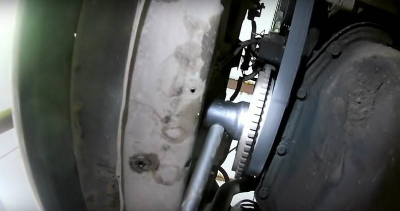 Болт вворачивается в просверленное отверстие, тем самым фиксируя зубья венца моховика. Таким образом, коленвал блокируется, что исключает его вращение.