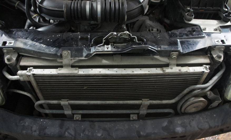 Сливается тосол, для лучшего доступа к двигателю снимается радиатор и вентилятор.