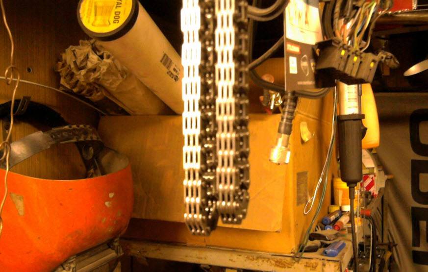 Старая цепь прикладывается к новой, на которую переносятся отметки белым маркером, сделанные в тех местах, где она будет одеваться на валы.
