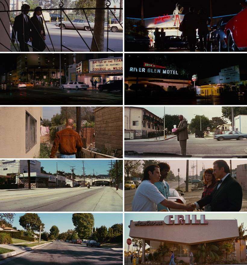 Примечательно, что на протяжении двух с половиной часов фильма »Криминальное чтиво» Квентина Тарантино, только единожды мы слышим подтверждение, что события разворачиваются в Лос-Анджелесе. Марселлас Уоллес говорит Бутчу, что тот потерял все привилегии в городе и должен сегодня же убраться. Как и в “Бешеных псах”, Квентин Тарантино уделяет больше внимания раскрытию своих персонажей, чем раскрытию локаций. Вне всяких сомнений, Лос-Анджелес полон интересных мест, культовых, но фильм не эксплуатирует их. Мы не увидим в кадре букв HOLLYWOOD или других символов города. Большая часть событий и диалогов происходит внутри помещений, с акцентом на людей и их истории. Более того, из-за множества культурных отсылок, антуража ресторана “Jack Rabbit Slim’s”, кафетерия, можно подумать, что мы попали в середину ХХ века. Но на дворе все же 1990-е и это еще одна невероятная особенность Pulp Fiction. В кадре лето, хотя Джулс и Винс Вега отмечают, что по утрам здесь бывает прохладно без одежды. Большая часть событий происходит днем, но есть и вечерние сцены, опять же, чаще интерьерные, а не на открытых локациях, как того можно было ждать.