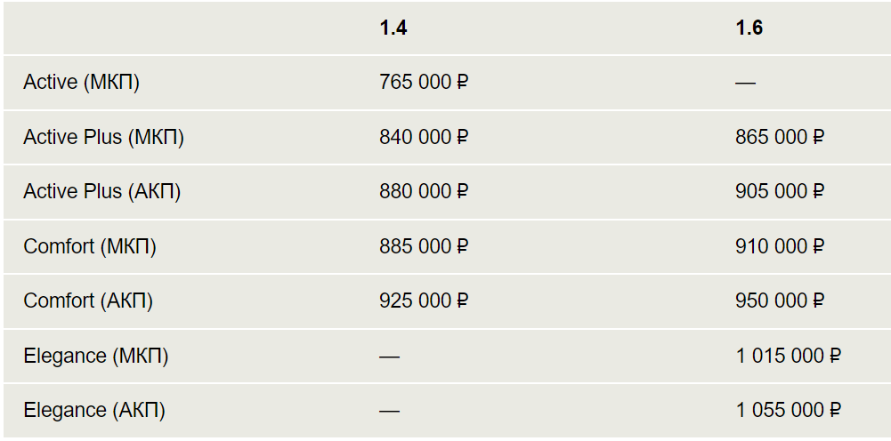 - Active Plus. Цена — от 840 тыс. руб. Коробку передач можно выбрать как механическую, так и автоматическую, а двигатель — 1,4 или 1,6-литровый.