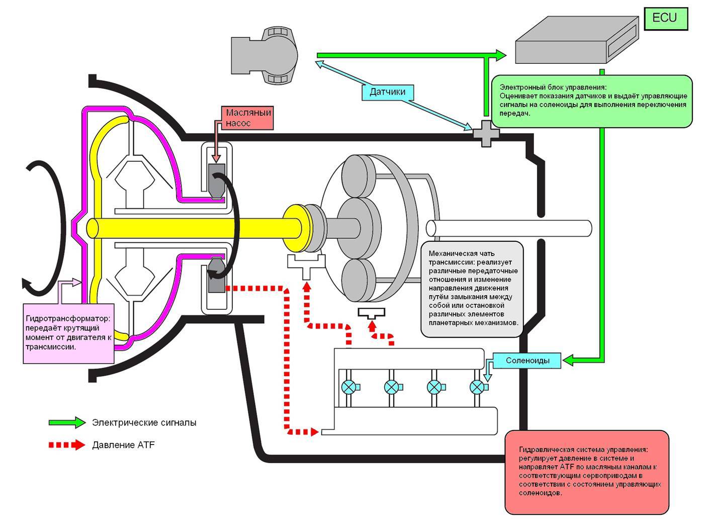 В автоматической коробке передач функция сцепления закреплена за гидротрансформатором, а за переключение передач отвечает электронный блок управления и исполнительные механизмы: фрикционные муфты, ленточный тормоз и т. д.