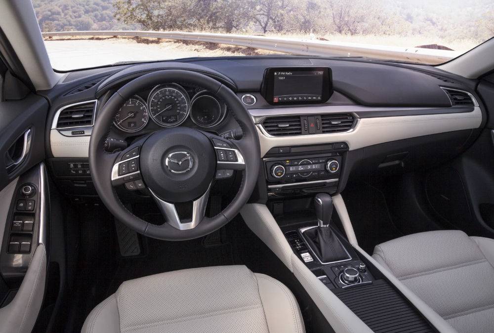 В Mazda 6 тоже имеется фальшдерево, но его здесь минимум, только полоска на передней панели и только у топовых модификаций. Центральная консоль выглядит солидно благодаря отделке чёрным пластиком с глянцевой поверхностью. На ней расположен дисплей климатической системы, показывающий её текущие настройки, а также панель управления мультимедийной системой, с дисплеем небольшого размера. Приборная панель у «шестёрки» соответствует модным веяниям – колодцы шкал очень глубокие, так что с чтением показаний не возникает проблем, даже если солнце светит прямо на «приборку». Но подсветка слишком яркая, в темноте глазам потребуется время для адаптации, что, конечно, большой минус. Кожаная отделка нареканий не вызывает. Спереди кожа перфорированная, исключающая эффект скольжения при вхождении автомобиля в крутые повороты.