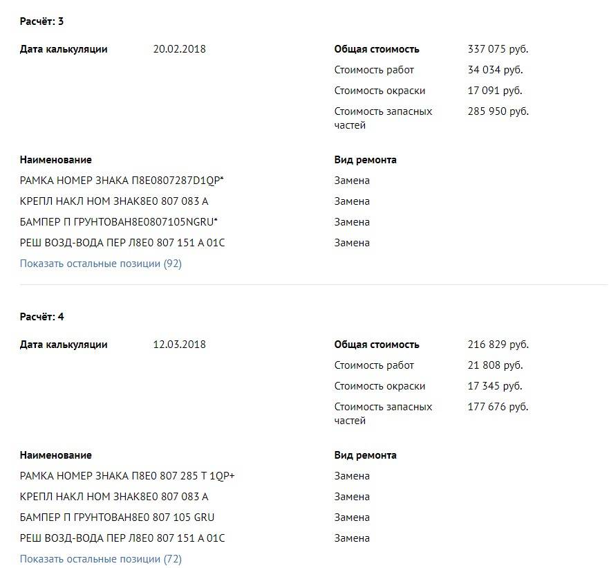 Третий, четвертый и пятый расчеты, скорее всего, произведены по аварии от 23 декабря 2017 года. Стоимость работ тоже режет глаза.