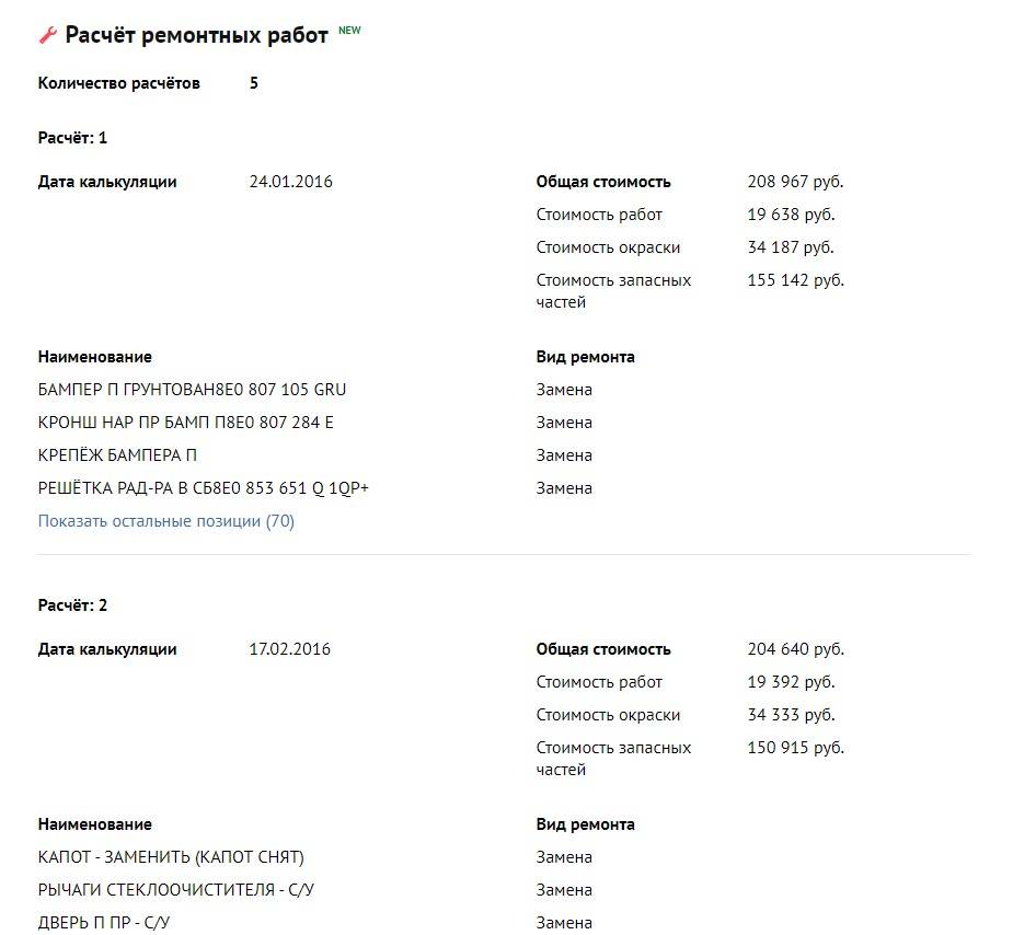 Ну, и посмотрим, что показывают расчеты ремонтных работ. Их, как мы уже сказали, пять. Первый и второй расчеты произведены в начале 2016 года, по всей видимости, по одному ДТП, которое не было оформлено в ГИБДД. Судя по списку работ, машина пережила удар передней частью. На восстановление ушло более 400 тыс. рублей.