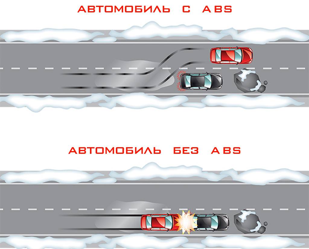 Автомобиль с АБС в большинстве случаев пройдет больший путь до полной остановки, но благодаря тому, что при этом водитель может управлять автомобилем он сможет объехать препятствие, а не просто беспомощно нажимать на педаль тормоза и надеяться, что автомобиль остановится вовремя.
