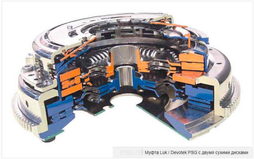 В преселективных 7-ступенчатых коробках DSG (Direkt Schalt Getriebe) сухого типа используются 2 фрикционные муфты сухого трения с электронно-гидравлическим способом управления.