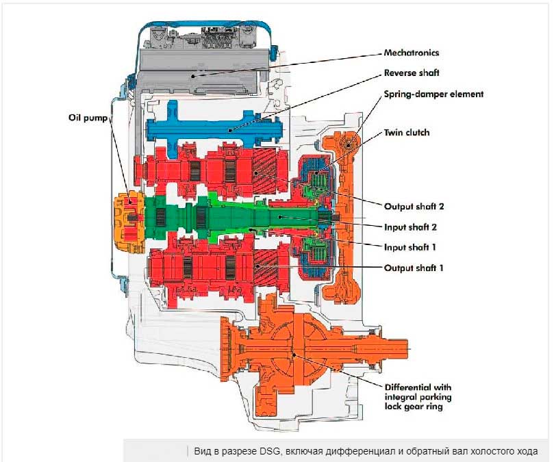 Все конструктивные компоненты расположены в картере ДСГ. Принцип работы агрегата описан ниже.