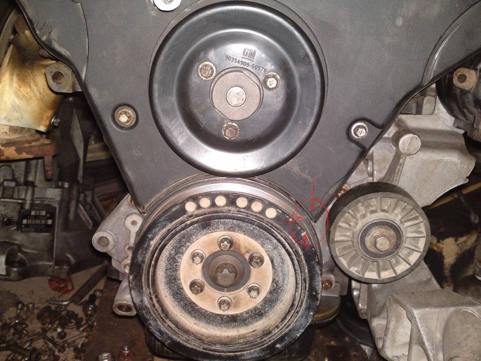 После установки кожуха, можно смело одевать шкивы. На шкиве коленвала имеется метка, которая совпадает с меткой на пластиковом кожухе, когда шестерня коленвала смотрит своей меткой вниз. В общем то удобно и продумано.