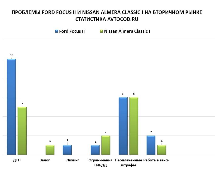 За последние 30 дней «Фокус 2» через avtocod.ru проверили более 29 тысяч раз, а «Альмеру» — более 2 тысяч раз. Мы выяснили, с какими проблемами продаются конкуренты, отобрав по 20 случайных отчетов по каждой модели. Вот что у нас получилось:
