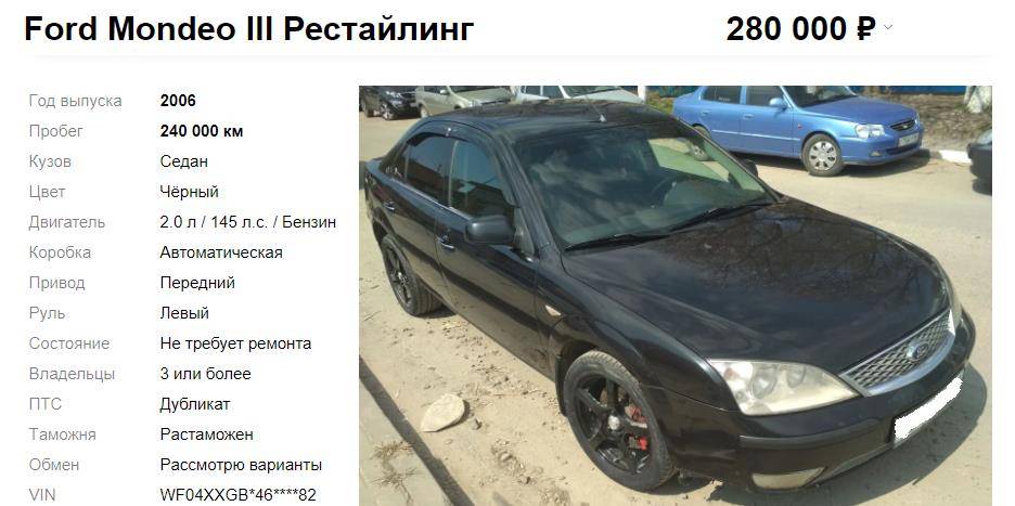 «Форд» 2006 г. в. с пробегом 240 тыс. км, мотором 2,0 и АКПП отдается немногим дороже: