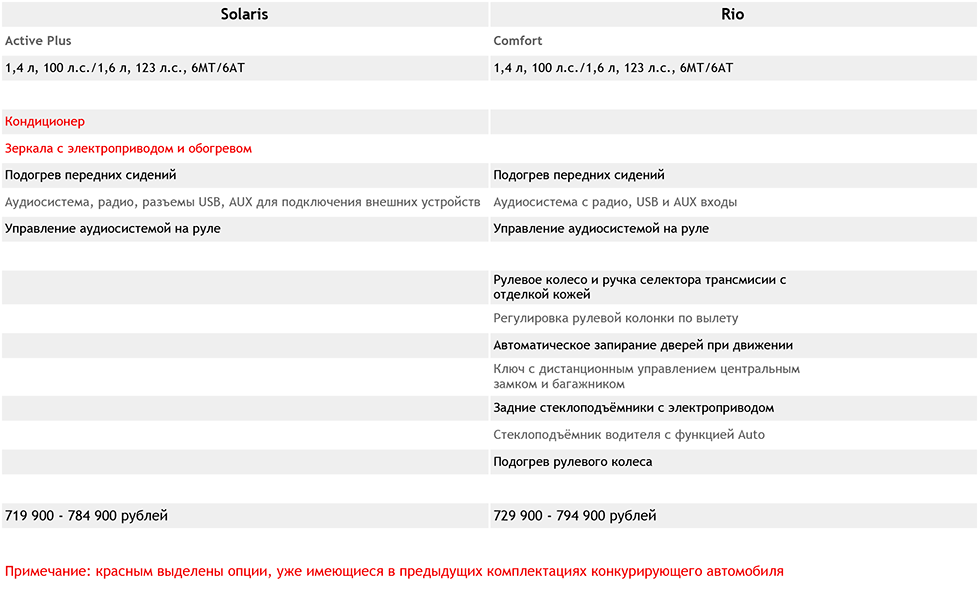 Впрочем, несмотря на эту довольно четкую параллель, не стоит воспринимать Solaris как буквально отстающий в этой паре, и тому есть две причины. Первая – в том, что на деле «разведение» моделей-близнецов, собираемых одной компанией на одном конвейере, все же остается скорее маркетинговым инструментом. Ведь ценовые вилки разных комплектаций пересекаются, и в пределах той же суммы, что озвучена выше, можно приобрести Solaris в следующем варианте комплектации – Comfort, хотя при этом, конечно, и придется довольствоваться менее мощным мотором или «механикой». Второй же нюанс заключается в том, что Solaris с момента своего дебюта уже пережил небольшое подорожание в среднем на десять тысяч рублей, а Rio – свежий игрок, но мы в обозримом будущем можем ожидать схожего повышения цен и на него.