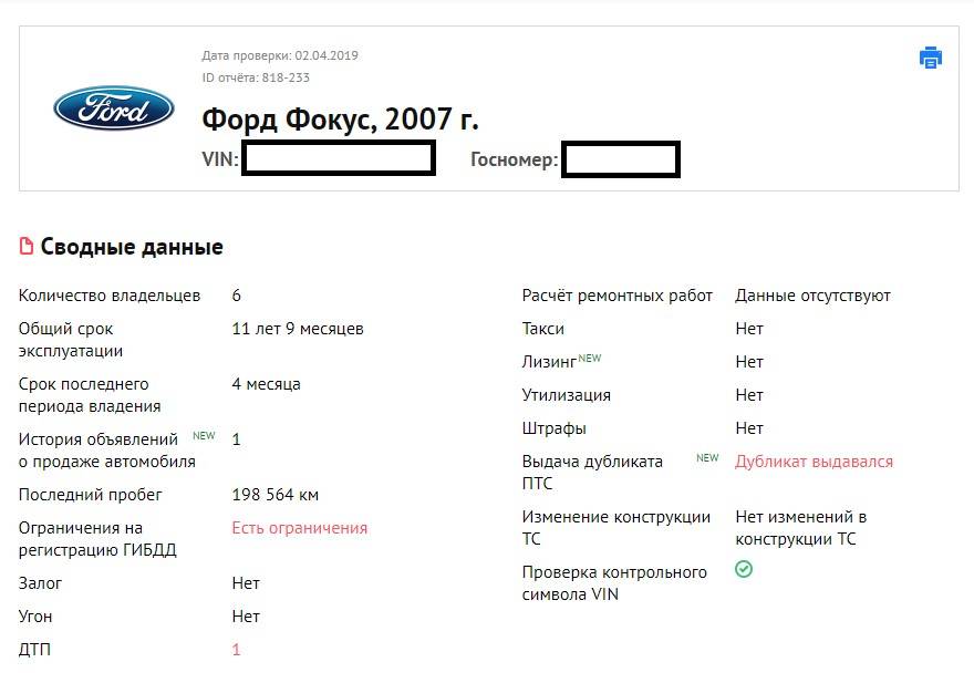 Проверка через avtocod.ru выявила несколько проблем: одно ДТП, дубликат ПТС и ограничения ГИБДД.