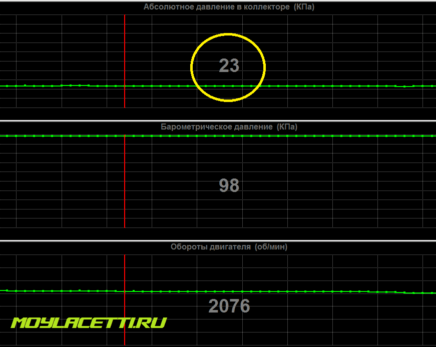 Примечание: При нажатии педали газа на холостом ходу и при отсутствии нагрузки на двигатель (кондиционер, обогрев заднего стекла и т.п.) заниженные показания (22-25 кПа) являются адекватными. Так и должно быть! Попробую на простом языке объяснить. При нажатии педали газа происходит резкий всплеск показаний – это отработал ДАД на изменение условий в коллекторе и двигатель ещё не успел раскрутится и “забрать” в себя воздух, вошедший через приоткрытую заслонку.