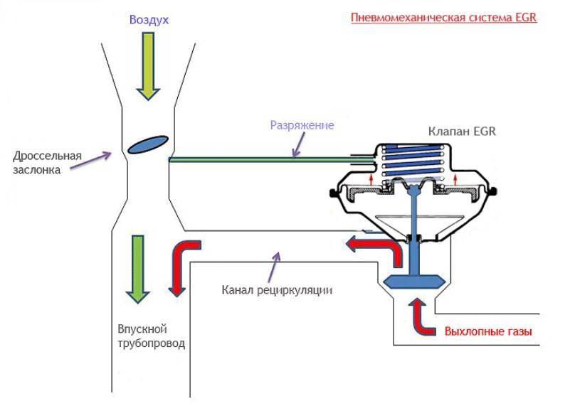 EGR — это аббревиатура английского термина «Exhaust Gas Recirculation», что переводится как «рециркуляция выхлопных газов». Основная задача такой системы — отвести часть газов из выпускного коллектора во впускной коллектор. Образование оксидов азота прямо пропорционально температуре в камере сгорания двигателя. Когда выхлопные газы из выхлопной системы попадают во впускную систему, концентрация кислорода, который работает как катализатор во время процесса сгорания, уменьшается. В результате температура в камере сгорания снижается и процент образования оксида азота уменьшается.