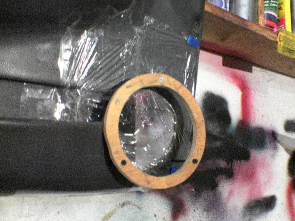 А в обшивке нужно вырезать окружность «отверстие» для крепежей облицовки «штатной».