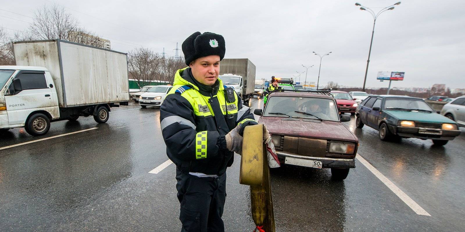 Завести авто «с толкача» тоже не удается, значит, придется переправить его на обочину, а оттуда вызвать эвакуатор. Для таких случаев в багажнике зеленого пикапа лежат строительные перчатки, а в салоне — жезл регулировщика. Один патрульный останавливает поток, второй подталкивает машину к безопасному участку. Как только препятствие с проезжей части убрано — затор рассасывается.