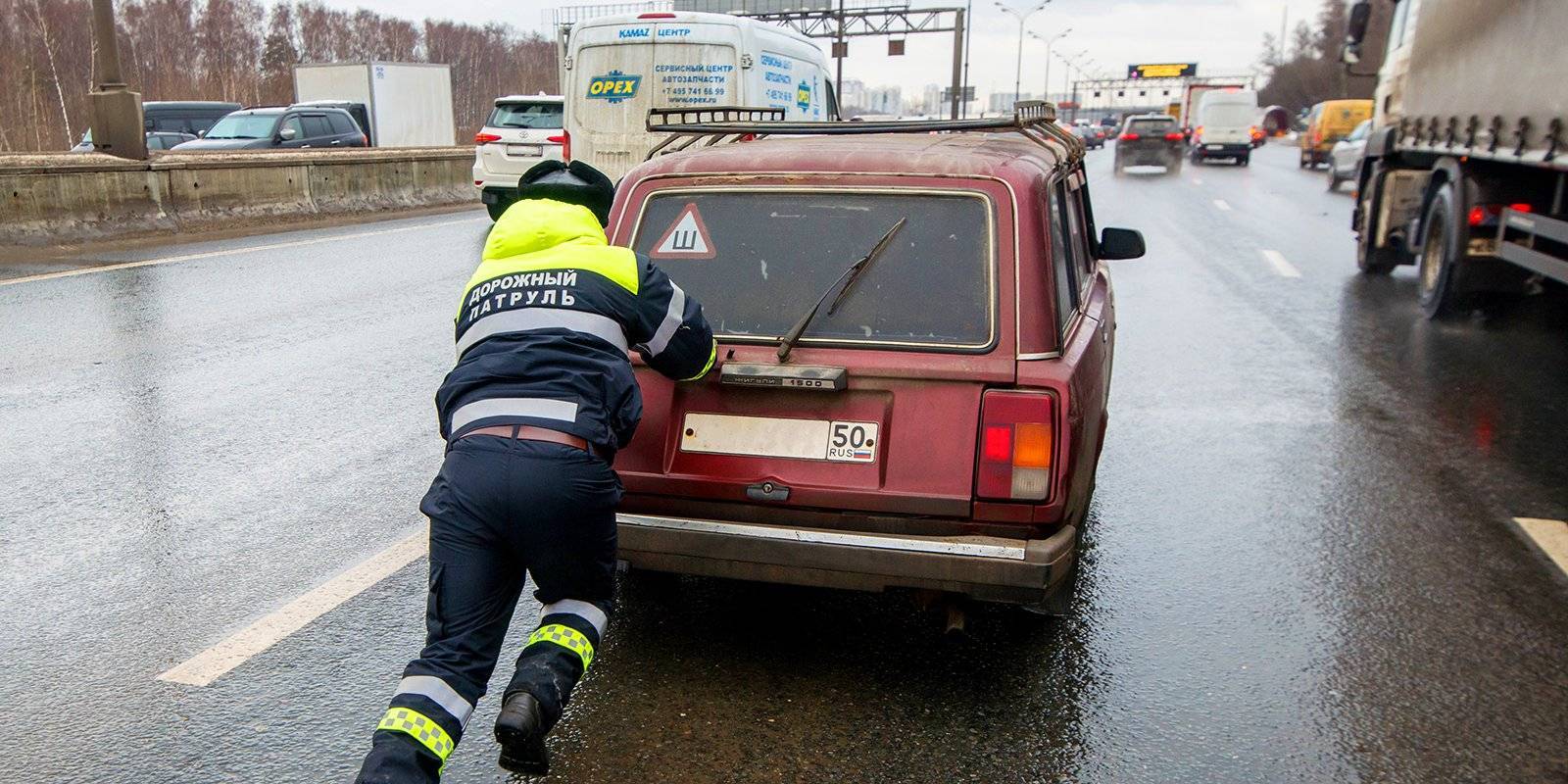 Бывает, просто сломалась машина или закончился бензин. Далеко за примером ехать не приходится: впереди затор. Его причина — старые жигули. Машина заглохла прямо посреди дороги, хозяин в растерянности ходит вокруг, в плотном потоке сделать что-то с автомобилем самостоятельно он не может. Первое, о чем заботится в таких случаях патруль, — ограждения. Дежурные выставляют на дороге оранжевые конусы и специальные знаки, чтобы обеспечить безопасность водителя и свою. А дальше начинается импровизация.