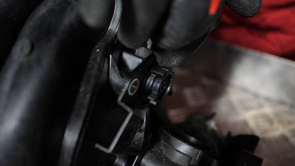 Со временем при работе двигателя впускной коллектор начинает стучать или стрекотать – это в нём стучит ось заслонки изменения длины. Т.е. она немного разбивает посадочные места в пластике, из-за чего появляется осевой люфт.