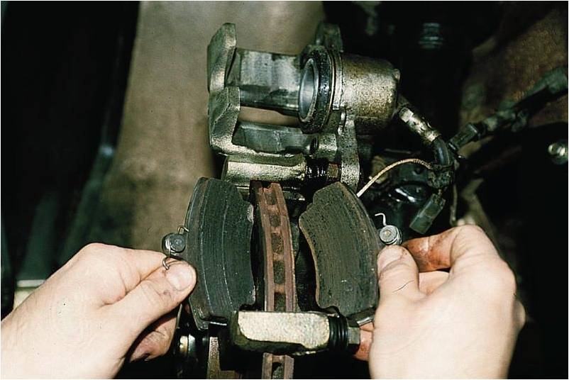 Ослабляем один из болтов и полностью выкручиваем другой. Отодвигаем кожух суппорта с фиксирующими скобами и достаем старые колодки.