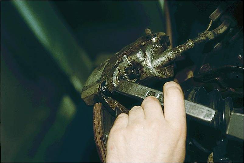 - С помощью отвертки или зубила отгибаем края стопорных шайб, фиксирующих направляющие болты от выкручивания. Также необходимо вставить отвертку между диском и тормозной планкой со стороны поршня суппорта. Надавите на планку, чтобы ослабить давление поршня и немного отвести колодки от диска. Это позволит поднять кожух и вытянуть колодки без усилия.