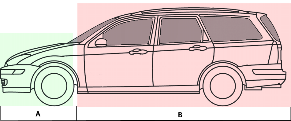 A — моторный отсек; B — пассажирский салон; C — багажник.