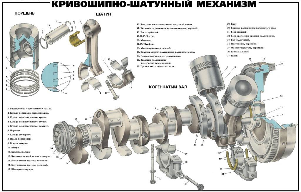 Кривошипно-шатунный механизм, входящий в конструкцию мотора, обеспечивает преобразование возвратно-поступательного перемещения поршня в гильзе во вращательное движение коленвала. Основным элементом этого механизма является коленвал. Он имеет подвижное соединение с блоком цилиндров. Такое соединение обеспечивает вращение этого вала вокруг оси.