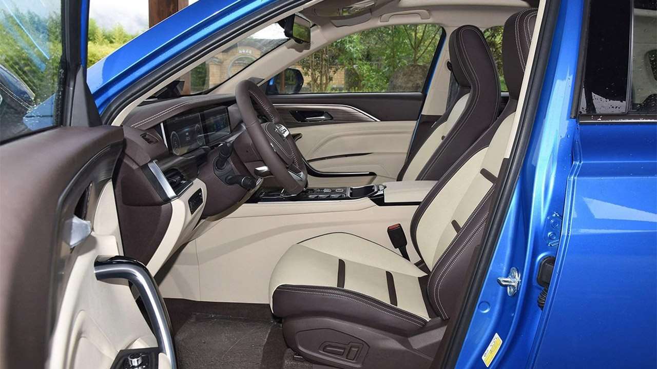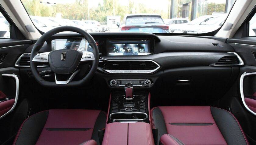 Другая особенность китайского кроссовера заключается в наличии двух широкоформатных дисплеев, один из которых выполняет роль приборной панели, а второй предназначается для управления встроенной электроникой. На центральной консоли встречаются два дефлектора и блоки аудиосистемы и климатической установки. Трансмиссионный тоннель выполнен в стилистике, характерной для моделей марки BMW. На это указывает присутствие компактного рычага КПП, нескольких физических клавиш, одной крупной шайбы и лакированного покрытия.