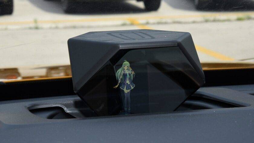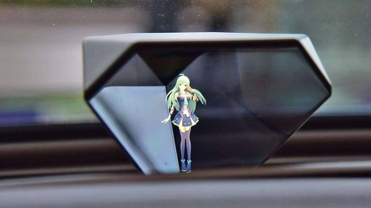 А теперь про девочку в юбке. Главная фишка T77 и что действительно новое в автомобильном мире – это голограмма голосового помощника наверху. Доступно три персонажа: робот, мальчик и девочка. Плюс можно менять цвета и 43 разных фоновых картинки.