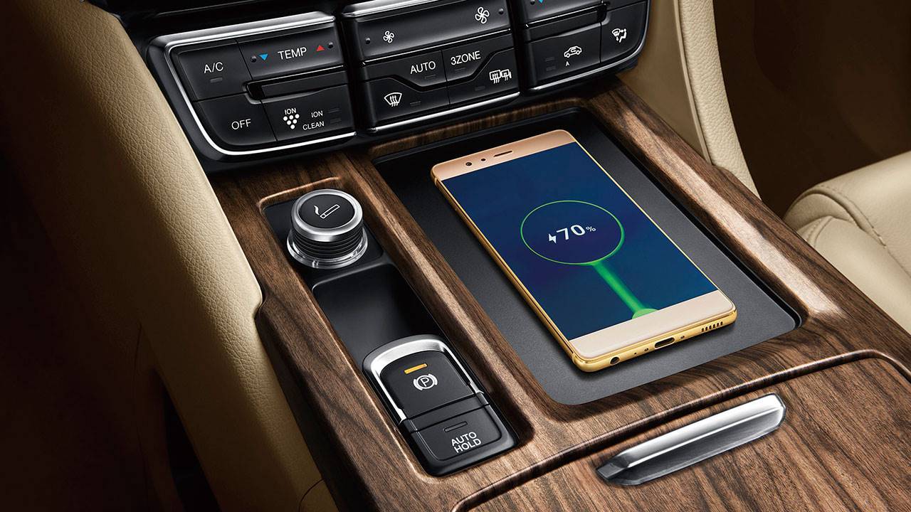 Центральный тоннель оснащен кнопкой электронного ручника, прикуривателем, нишей с подстаканниками и самое главное – площадкой с беспроводной зарядкой смартфона. Плюс есть два дополнительных USB-порта, а вот на заднем ряду почему-то один.