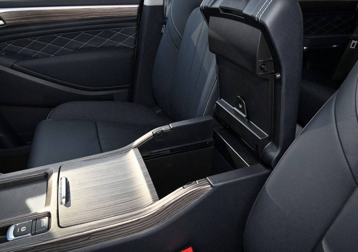 На центральной консоли главенствует широкоформатный дисплей с сенсорным управлением. По бокам от него расположились дефлекторы обдува. Вместе с экраном они окантованы прямоугольной металлизированной рамкой с двумя скругленными углами. Ниже располагается рычаг переключения скоростей, а рядом с ним блок управления климатической системой и другие сервисные кнопки, включая аварийку, а также джойстик переключения режимов коробки. Еще ниже расположена розетка прикуривателя и пепельница, рядом с которыми находится беспроводная зарядка для смартфона.