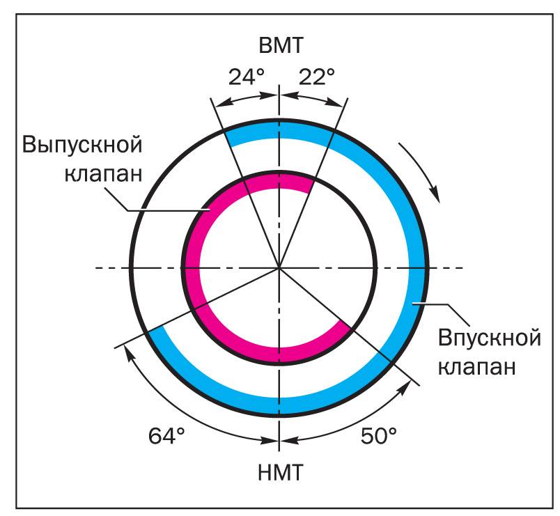 Для каждого двигателя завод-изготовитель указывает фазы газораспределения в виде диаграммы, где показаны моменты открытия, закрытия, и перекрытия клапанов.