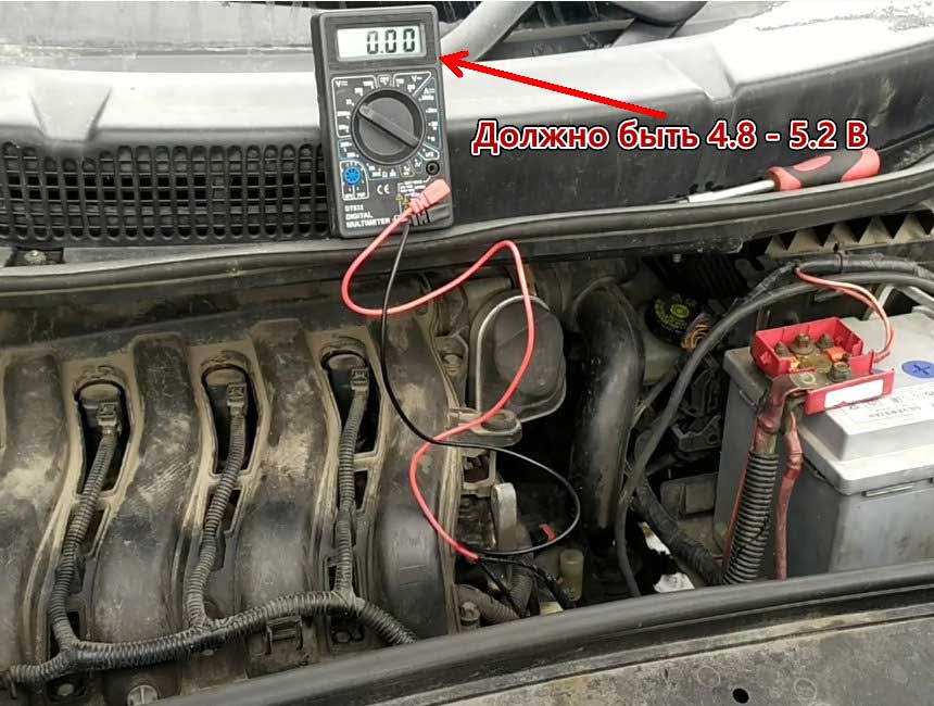 - Проверить, приходит ли на датчик температуры питание от электронного управления, равное 5 Вольт. Сделать это можно с помощью мультиметра. Для этого нужно включить зажигание (двигатель можно не запускать).