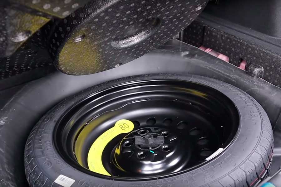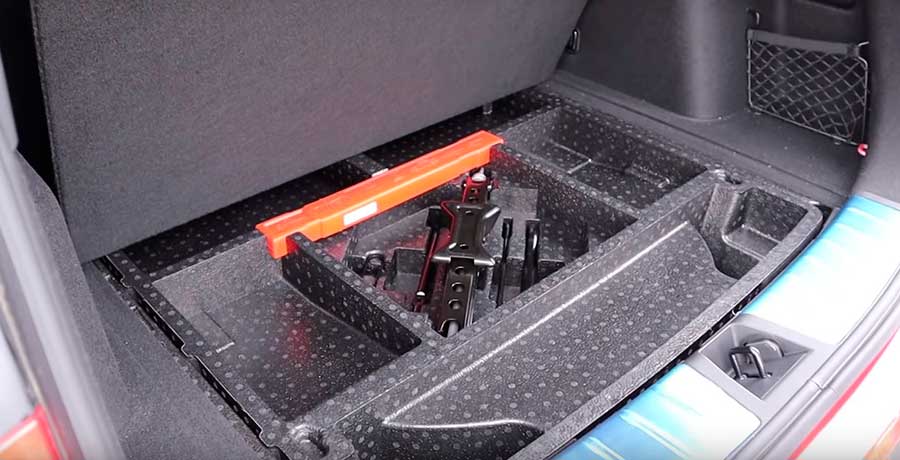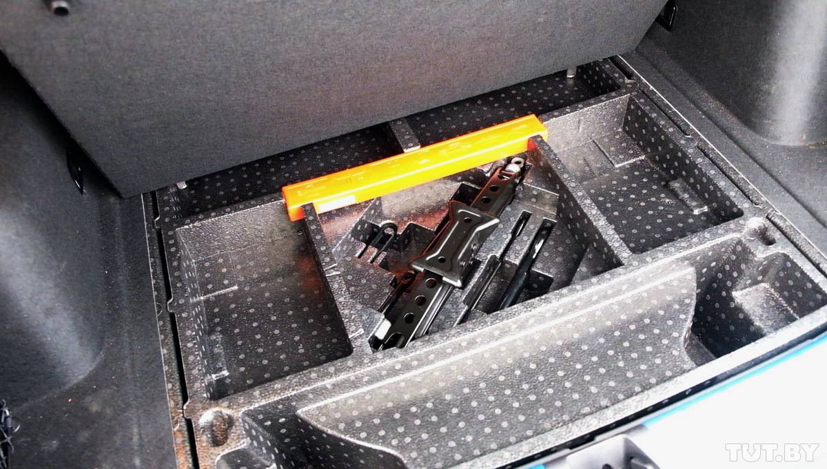 Под двойной фальшпанелью в нише спрятана малоразмерная запаска, сверху которой укладывается органайзер с инструментом и отделениями для крепежа и других мелких предметов, внутри отсек для грузов обшит мягким и достаточно качественным материалом.
