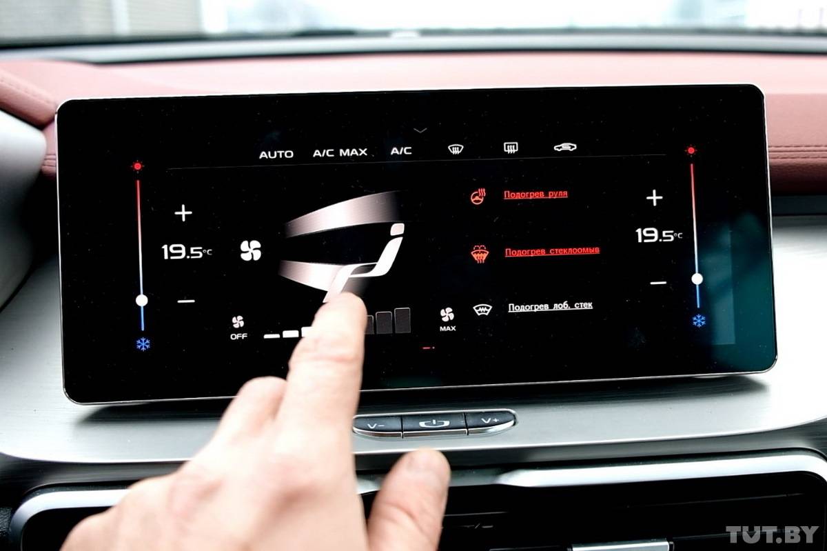 Сам же дисплей выполнен в прямоугольной форме и на вид, как будто небольшой планшет, установленный на специальный крепеж. Опускаясь ниже по центральной консоли Geely Coolray, дизайнеры расположили пару прямоугольных воздуховодов и панель управления климат-контролем. Несмотря на то, что многие производители сейчас переводят управление на сенсорные дисплеи, в Coolray сыграла классика, где управление механическое с помощью кнопок и вертелок.