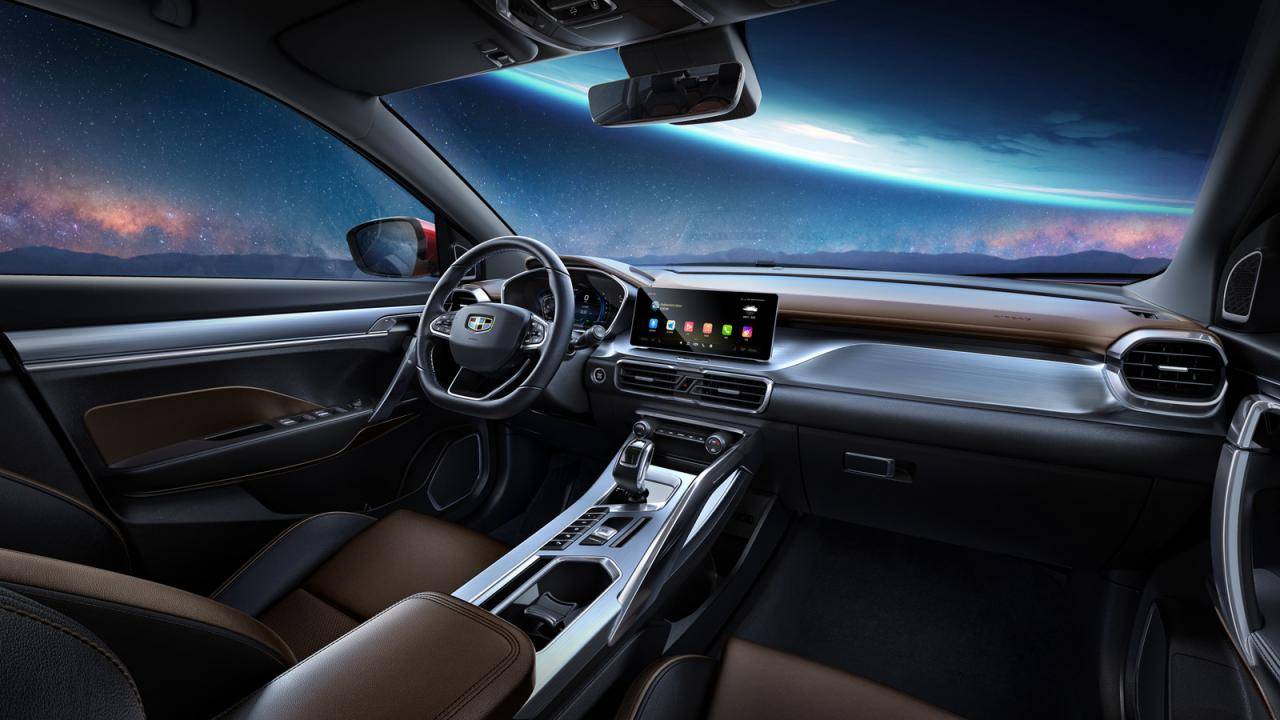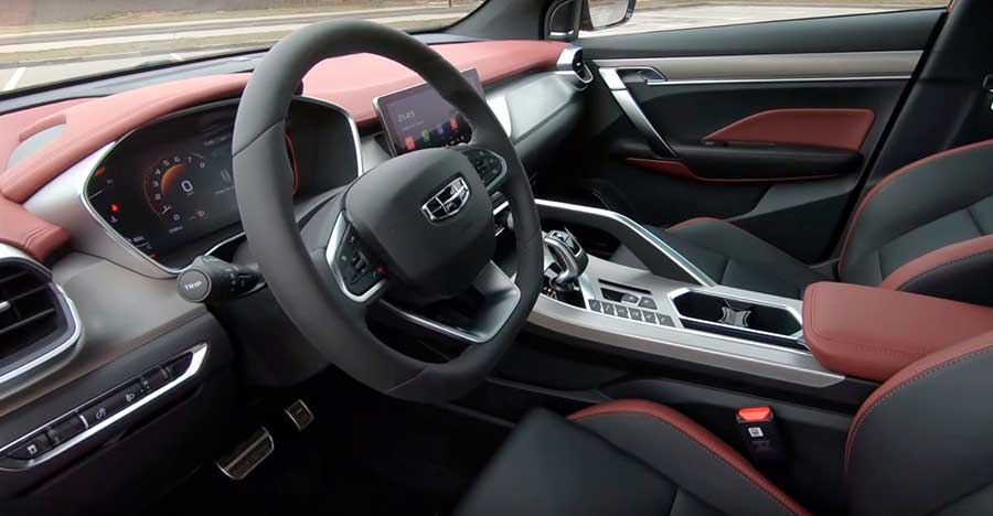 Интерьер внедорожника Coolray 2020 выглядит свежо и молодежно, чему способствует фактически трехцветная контрастная отделка, представленная двумя вариантами кожи и фактурой «под алюминий».
