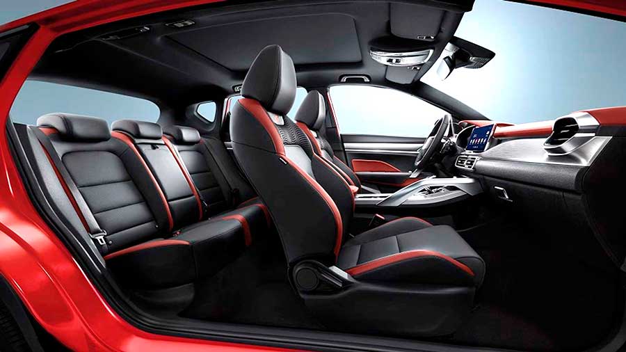 Ярче всего, судя по фото, выглядит передок паркетника. Начинается он с сильно наклоненного ветрового стекла, переходящего в невысокий, но кряжистый моторный отсек. Его украшает крышка капота, слегка наклоненная вперед и отмеченная гранями продольного рельефа. Сразу перед ним красуется тонкий пятиугольник радиаторной решетки с хорошо заметным шильдиком компании. Его изящность подчеркивается снизу хромированной линией, визуально соединяющей друг с другом узкие, длинные головные фары, где внутри будут ксеноновые и светодиодные огни.